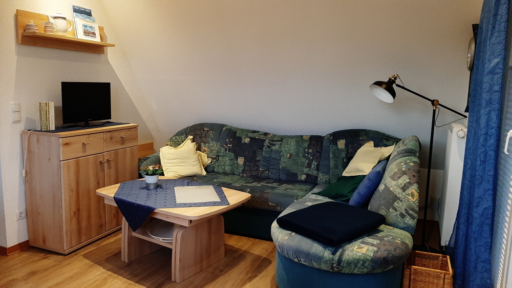 Auf der gegenüber liegende Seite befindet sich eine Couch die als Schlafcouch ausziehbar ist. Der Tisch ist höhen-verstellbar und ausziehbar. Der Fernseher hat eine eigene Schüssel.