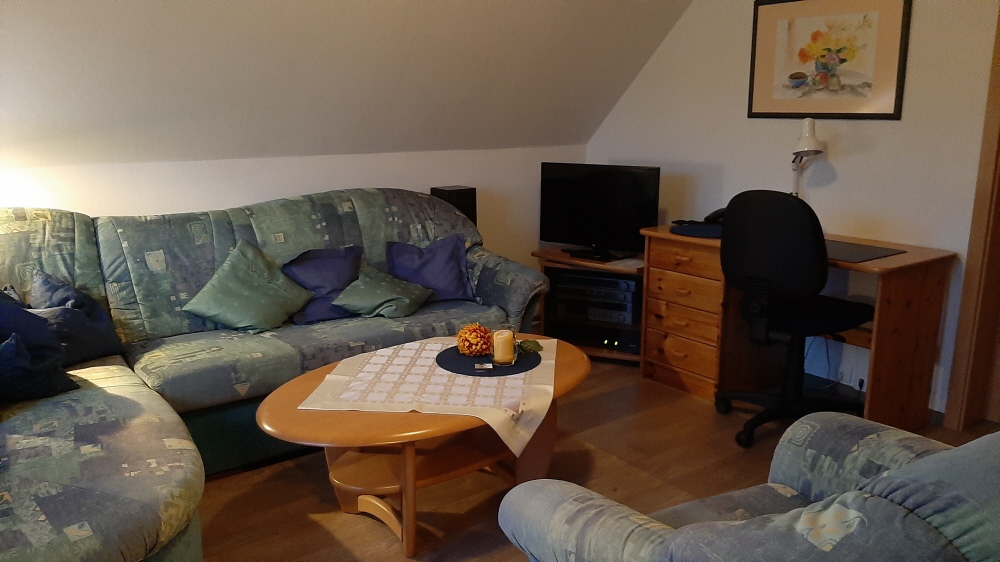 Im Wohnzimmer ist eine Couch die als Schlafcouch ausziehbar ist. Ein Schreibtisch mit Schreibtischstuhl und Schreibtischlampe sowie Lan-Anschluss und WLan-Zugang steht zur Verfügung. Ein Vitrinenschrank mit Geschirr, Gläser sowie in den Schubläden Spiele, Tischwäsche usw.  sind vorhanden. Das Badezimmer ist mit einer Dusche, Waschmaschine, Fön und Badmöbel ausgestattet. Handtücher stehen kostenlos zur Verfügung.